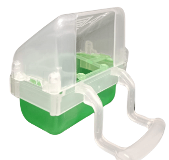 Comedero Lucía con posadero, para exterior de jaulas con el cajón extraíble y peine separador en el interior.